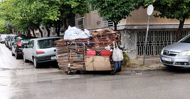 Καρότσια φορτωμένα με στοίβες χαρτόνια ” σταθμευμένα” είτε πάνω σε πεζοδρόμια , είτε στις γωνίες των δρόμων, καρότσια γεμάτα από υλικά που έχουν λεηλατηθεί από τους μπλε κάδους του δήμου κ.α.