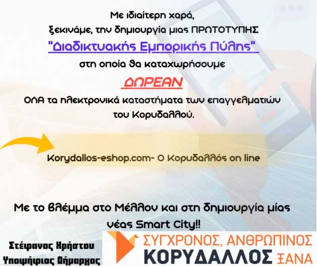 👉Μετά από πρόταση του Υποψηφίου Δημ.Συμβούλου, με τον Συνδυασμό μας, Σύγχρονος Ανθρώπινος Κορυδαλλός, Ξανά, του Θεόδωρου Νικολάου 👥ξεκινάμε με ιδιαίτερη ικανοποίηση την δημιουργία ενός site που θα είναι συγκεντρωμένα όλα τα καταστήματα του Δήμου μας!
